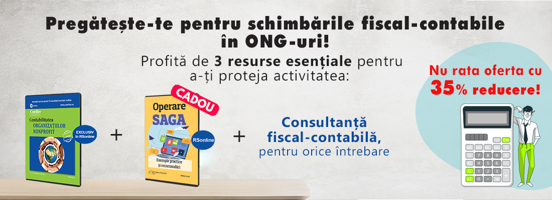 Sunt operatiuni care daca nu sunt efectuate in mod corect, vei plati scump! Cu amenzi de peste 5.000 lei! Ori, nu cred ca ai nevoie de asa ceva! Comanda acum pachetul promotional cu 35% REDUCERE care contine lucrarea Contabilitatea Organizatiilor Non-Profit (format electronic in platforma RSonline)!